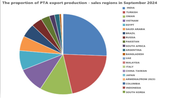 China exported 380,700 tonnes of PTA in September, a 31% increase on last year. Most went to Asia. India was the main region for PTA import this month, with 97,600 tons (25.65%). Turkey and Oman were the second and third largest importers, with 79,700 tons(20.95%) and 46,000 tons(12.08%).Vietnam imported 37,700 tons(9.90%), while Egypt imported 30,000 tons(7.88%).