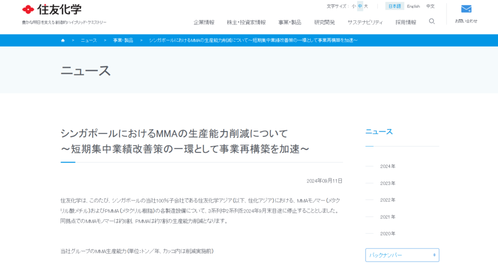 Sumitomo Chemical has reduced its capacity due to an imbalance in the MMA industry. This will affect the company’s future profits, especially for general products.